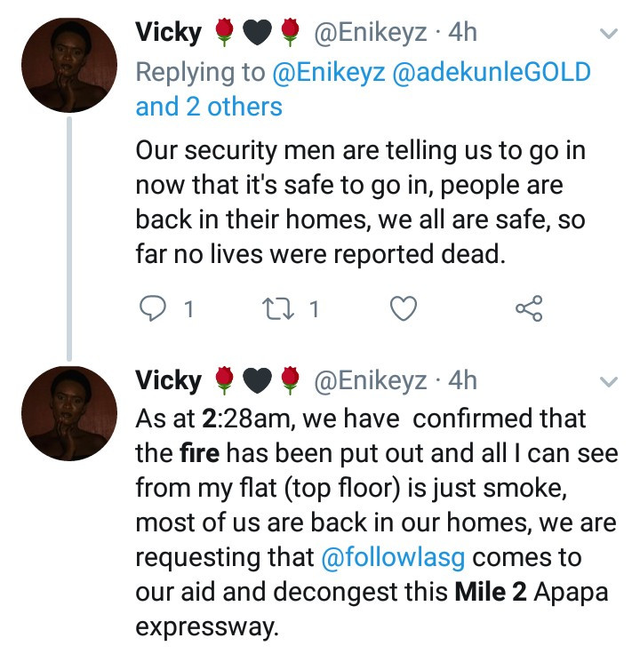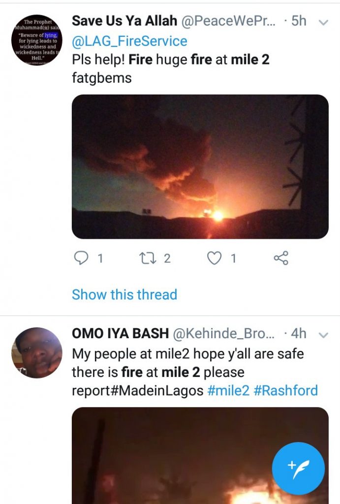 Residents took to Twitter to call for help and express concern for their lives and properties as petrol laden trucks continued to burn.