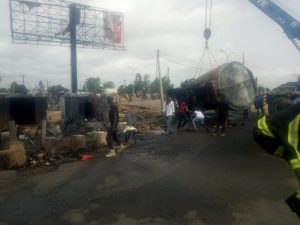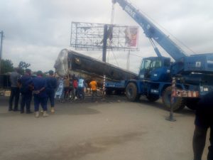 Firefighters and men of the FRSC were on hand to lift the wreckage of the tanker off the road using a motorized crane.