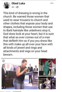 “This kind of dressing is wrong in the church. Be warned those women that used to wear trousers to church and other clothes that expose your body and shapes, including those women that use to Barb hairstyle like unbelivers stop it, God does look at your heart, but it is sure that what so ever comes out of a man that defileth him so if you you dress like this with make up all over your face with all kinds of jewerly and rings and attachments and wigs on your head be warned.” he wrote on Facebook today, August 16.