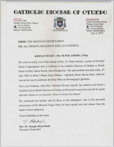 “We write to notify you of the kidnap of Rev. Pr. Peter Amodu, a priest of the Holy’ Ghost Congregation who is working in the Catholic Diocese of Otukpo as Parish Priest of Holy Ghost Parish, Eke-Olengbeche,” the circular read.