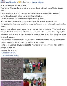 “Mike died a violent death, killed by the enemy’s bullet. We pray God to guide the police to uncover the people behind his gruesome assassination. We need justice and the Wicked must be made to taste the bitter repercussion of the water of justice. Rest on Sir.”