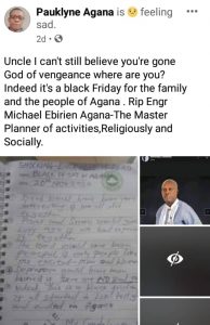 Engr. Michael Ebirien Agana was a good man. I got to like him in my early days as a Youth Star of the Anglican Youth Fellowship Nig. Uncle Mike was one of the AYF leaders to reckon with. Uncle Mike and the likes of Bro Anthony Waribo now Chief Uruk, Mr.Barth Nengia, late Wilcox Ngbowa (Then-President AYF), Bro Bethel Pious now (a Priest), Gogo Ubulom, and many others made my entrance into the popular Anglican Youth Fellowship Worthwhile,”