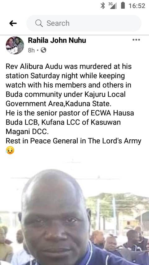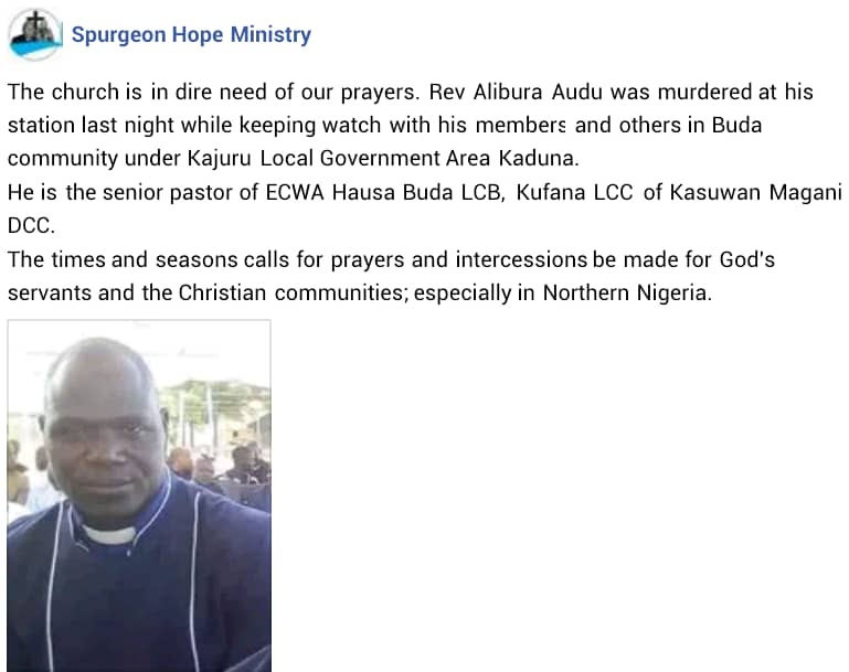 It was gathered that Rev. Alibura Audu, 45, a senior pastor of ECWA was killed by the gunmen while keeping watch with his church members.