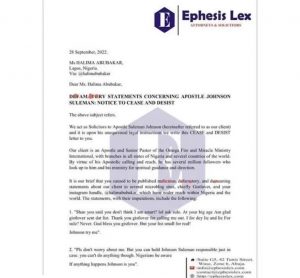 “Dear Ms Halima Abubakar, Our client is an Apostle and Senior Pastor of the Omega Fire and Miracle Ministry International, with branches in all states of Nigeria and several countries of the world.