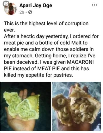 “This is the highest level of corruption ever. After a hectic day yesterday, I ordered for meat pie and a bottle of cold Malt to enable me calm down those soldiers in my stomach.