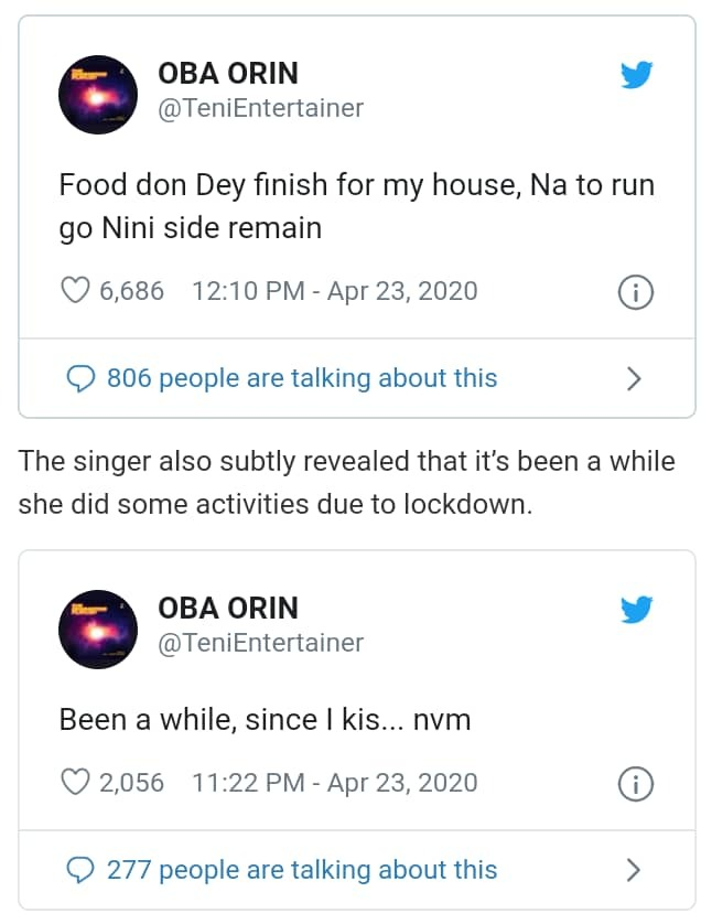 Nigerian singer, Teniola Apata otherwise known as Teni ‘the’ Entertainer has revealed she has almost finished her foodstuffs at home as a result of the coronavirus-induced lockdown in Lagos state.