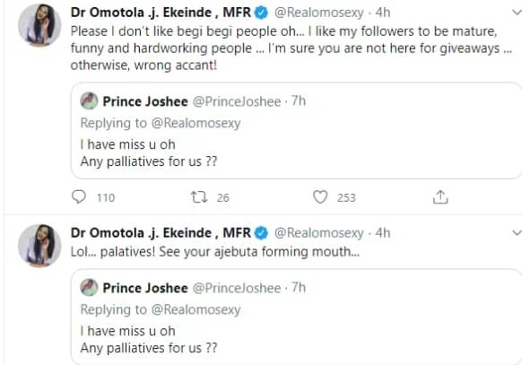 “Please I don’t like begi begi people oh… I like my followers to be mature, funny and hardworking people … I’m sure you are not here for giveaways … otherwise, wrong accant!”
