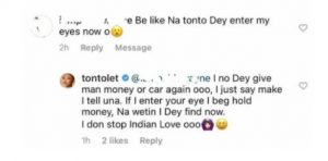 ”I no dey give man money or car again ooo. I just say make I tell una. If I enter your eye, I beg hold money. Na wetin I dey find now. I don stop Indian love ooo”