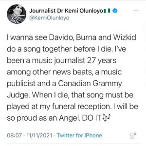 “I wanna see Davido, Burna and Wizkid do a song together before I die. I’ve been a music journalist 27 years among other news beats, a music publicist and a Canadian Grammy Judge. When I die, that song must be played at my funeral reception. I will be so proud as an Angel. DO IT🎶”. She tweeted.