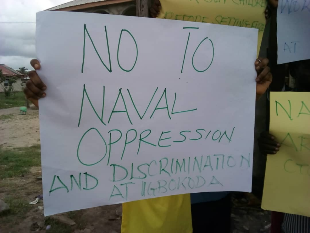 Carrying placards of different inscriptions, like, “NO TO NAVAL OFFICERS OPPRESSION,” “A FAMILY LIVELIHOOD HAS BEEN DESTROYED BY NAVAL OFFICERS AT IGBOKODA,” “NO TO NAVAL MADNESS AT IGBOKODA…” amongst others, they were in different groups of less than ten each – in observing the social distancing on covid-19 orders. They appealed to Governor Akeredolu to wade in urgently.