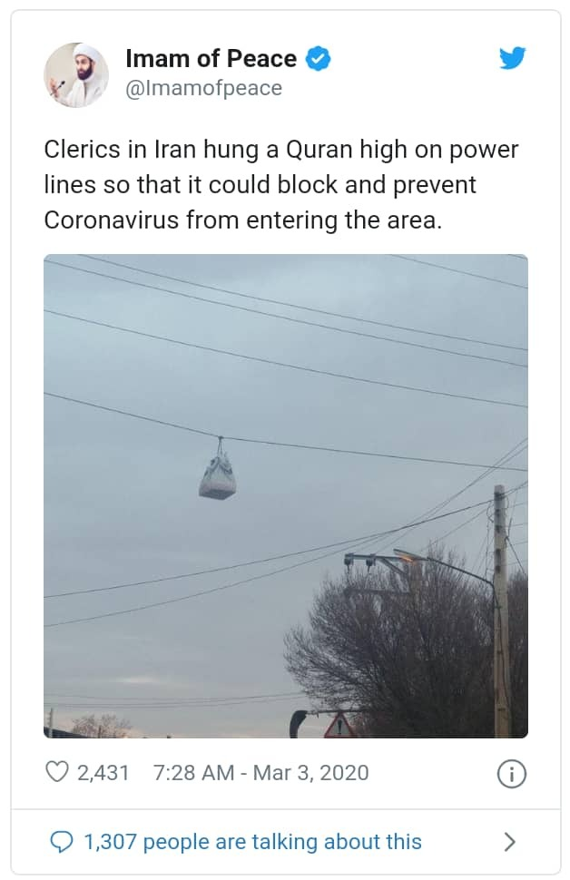 “Clerics in Iran hung a Quran high on power lines so that it could block and prevent Coronavirus from entering the area,” his post read.