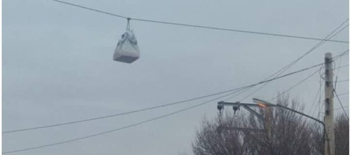 The image captured a bag that contained some items which were hanging across power-lines on a street.