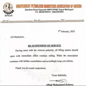 The Independent Petroleum Marketers Association of Nigeria (IPMAN) has called off the suspension notice earlier sent to its members following amicable resolution of the issues of contention, which led to panic buying by members of the public.