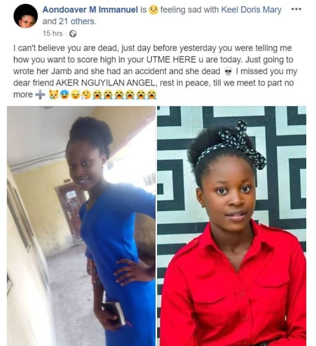 Comr Akaaza Ayila Samuel: Miss Angel Nguyilan Aker. It’s so sad, I can’t believe that you will leave me in this UNIVERSITY OF CALABAR to day. Even when we were in physics department yesterday, you did not told me “you will live me today” Now I’m left alone with tears. It’s very touching, may your soul rest in peace with the Lord till we meet to part no more amen. (Missed you for ever).