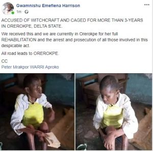 Human rights activist, Harrison Gwamnishu, who shared the story, said that the woman is originally from Ozoro in Delta state but got married to a man from Orerokpe. He said the husband and his family members, after many years of marriage, accused the lady of being a witch and threw her into a cage they built in his compound.
