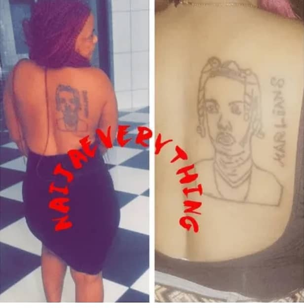 A lady who is definitely a big fan of controversial Nigerian singer, Afeez Fashola also known as Naira Marley has shocked many after getting some inking of the singer’s head on her back.
