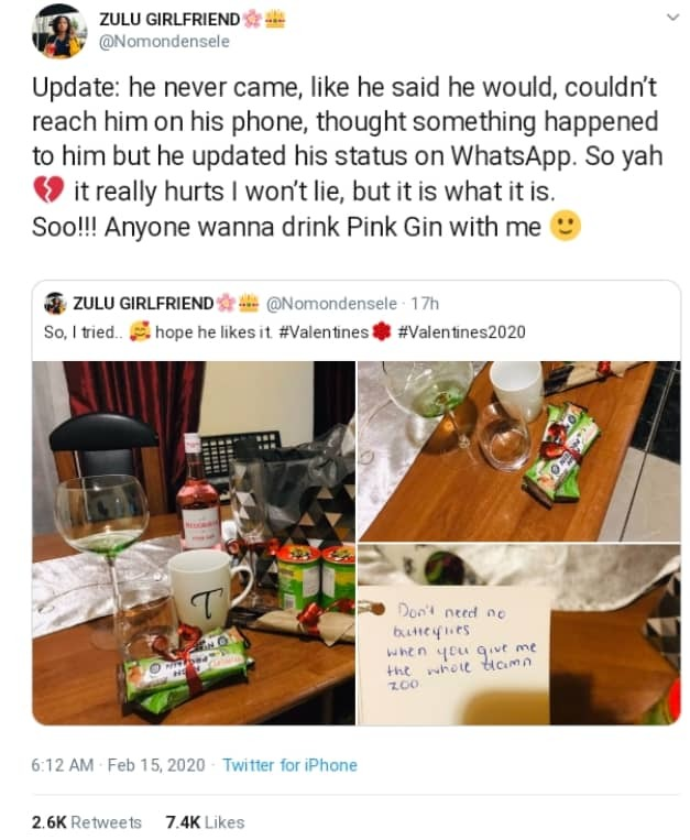 “Update: he never came, like he said he would, couldn’t reach him on his phone, thought something happened to him but he updated his status on WhatsApp. So yah 💔 it really hurts I won’t lie, but it is what it is.