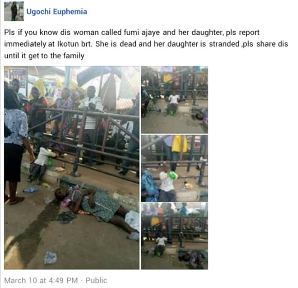 An eyewitness, Ugochi Euphemia, shared photos on Facebook and it shows the deceased’s daughter beside her body, unaware her mother is dead.