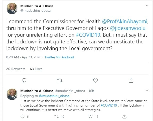 “I commend the Commissioner for Health @ProfAkinAbayomi, through him to the Executive Governor of Lagos @jidesanwoolu for your unrelenting effort on #COVID19.