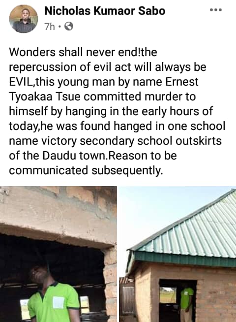 A man identified as Ernest Tsue Tyoakaa has committed suicide in Benue State.