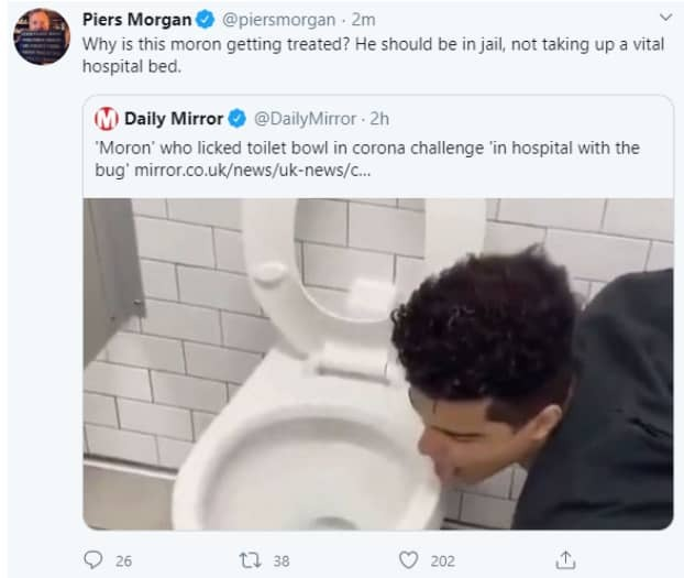 “You may remember also the other idiot, this is also in America, as part of the coronavirus challenge some morons are doing, went into his local toilet cubicle and licked the bowl.