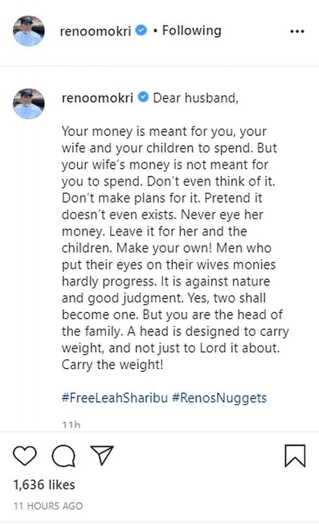 Reno who dropped another of his nuggets on Instagram told men to make their own money because their wife’s money isn’t theirs.