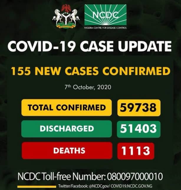155 new cases of Coronavirus was recorded in Nigeria on Wednesday October 7 as confirmed by the Nigeria Centre for Disease Control.
