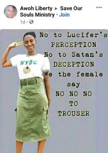 Liberty shared the photo on various Christian Facebook groups on Sunday and on the photo, a text which reads, “No to Lucifer’s Perception. No to Satan’d Deception. We the female say no no no to trouser” can be seen.