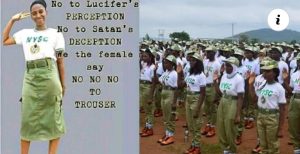 Nigerians react after Deeper Life Church member shared photo of Corps member wearing khaki skirt and saying female trousers are “Satan’s deception.