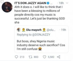 “Ahh it does o. I will like to think that I have been a blessing to millions of people directly cos my music is successful. Let’s just be thanking GOD sha“, he tweeted.