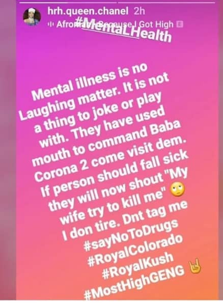 Part of her post reads, ” Mental illness is no laughing matter. It is not a thing to joke or play with. They have used mouth to command Baba Corona 2 come visit dem. If person should fall sick they now shout “My wife try to kill me”. I don tire. Don’t tag me. #SayNoToDrugs #RoyalColorado #RoyalKush #RoyalMostHighGeng.”