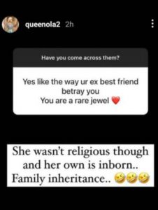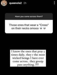 “I know the ones that pray 5 times daily. They are the most wicked beings I have ever come across. They gossip pass anything.” she wrote.