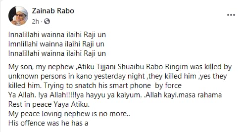 My son, my nephew, Atiku Tijjani Shuaibu Rabo Ringim was killed by unknown persons in kano yesterday night, they killed him, yes they killed him. Trying to snatch his smartphone by force