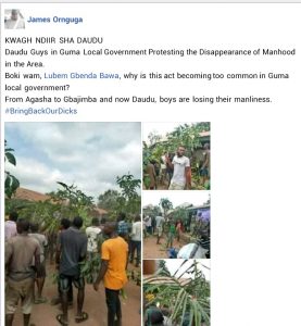 Youths in the Daudu community, Guma Local Government Area of Benue State on Sunday, November 1, staged a protest over alleged incessant disappearance of manhood in the village.