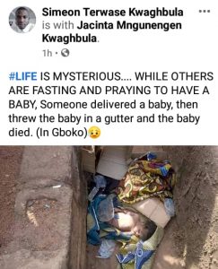 “Gboko girls why. This bouncing baby boy was dumped in a gutter yesterday night at JS Tarkar Way. Message to the girl. You shall have no peace.”