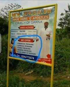 The church which is based in Ghana, has a signpost that may likely be an error as it states that they offer different kinds of problems instead of solutions to problems as well as all kinds of diseases.