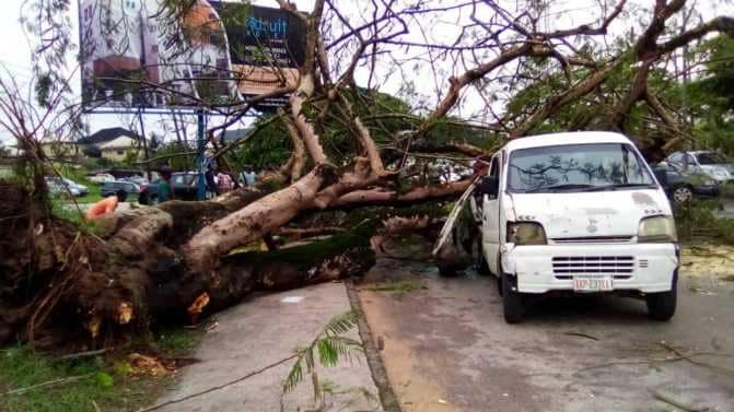 Eight passengers and a driver escaped death by the whiskers on Tuesday, September 8, after a huge tree branch broke off from its trunk and fell on a vehicle in Calabar, the Cross River State capital.