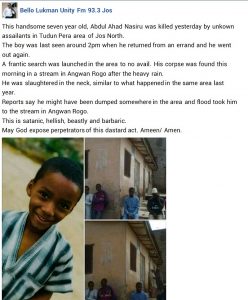 According to one Bello Lukman of Unity Fm 93.3 Jos, the boy was last seen around 2 pm on Thursday, September 23, when he returned from an errand and went out again.