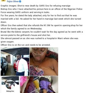 A police officer identified as Bishop Eno has been accused of shooting a woman in Delta State after she allegedly turned down his marriage proposal.