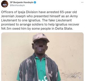”Officers of Ipaja Division have arrested 65-year old Jeremiah Joseph who presented himself as an Army Lieutenant to one Ignatius. The fake Lieutenant promised to arrange soldiers to help Ignatius recover N4.5m owed by some people in Delta State.