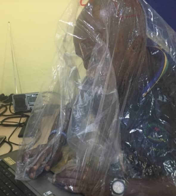 Photos of a police officer in Enugu state covering himself from the head downwards with a large transparent bag has gone viral after being shared online.