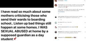 She said partly, “Don’t get it twisted… Mon$ters can be anywhere. I was a day student and was RAPED during school terms and holidays by a BEA$T.
