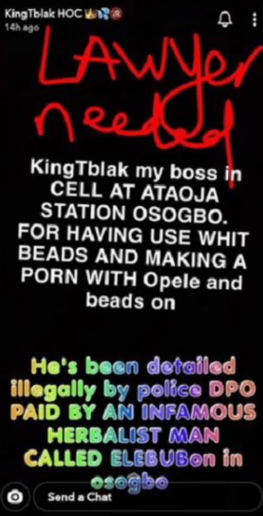 An associate who took to Kingtblakhoc’s Snapchat account to plead for help, said the porn star is being detained at Ataoja police station in Osogbo, Osun state capital.