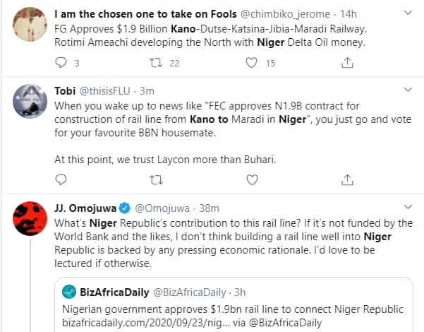Nigerians have reacted to the federal government’s approval of $1,959,744,723.71 contract for a rail line that would link Nigeria to the Niger Republic.