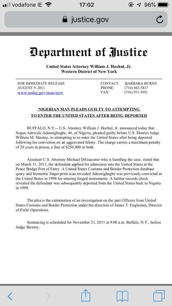 On March 11, 2011 GIO TV gathered that Oluwo Of Iwo applied for admission into the United States at PEACE BRIDGE PORT OF ENTRY. A United States Custom And Border Protection database query and biometric fingerprint scan revealed Adeonigbagbe Segun Adewale was previously convicted in the United States in 1998 for forged instruments. Further records checked revealed the defendant was subsequently deported from the United States back to Nigeria in 1999. Assistant U.S Attorney Michael DiGiacomo was the one handling the case.