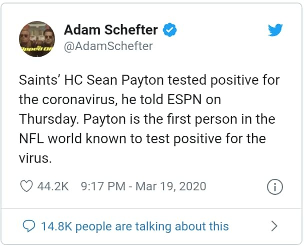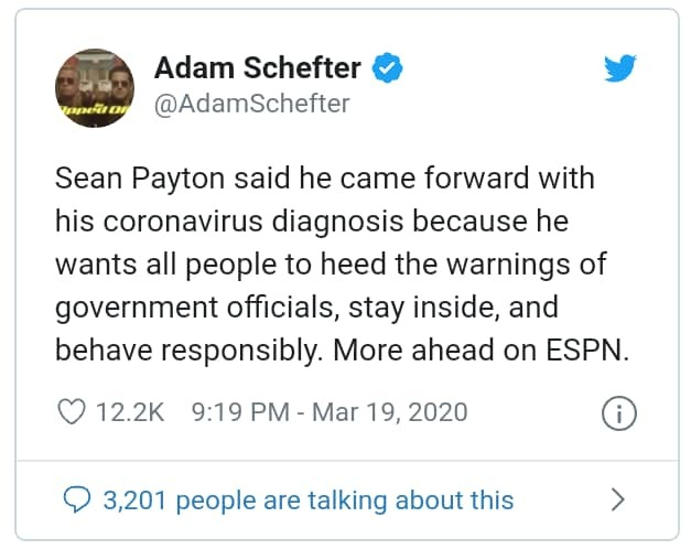 Schefter reports Payton made his test results known to warn all people to listen to government officials, to stay inside and behave responsibly.