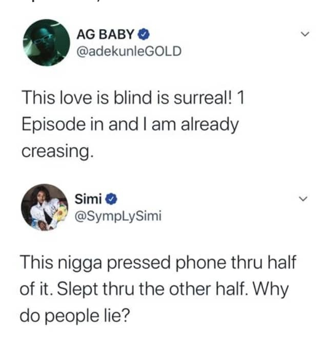 Adekunle Gold, had tweeted about watching a particular TV show when Simi hilariously came for him, tweeting “This nig*a pressed phone through half of it. Slept through the other half of it. Why do people lie?”