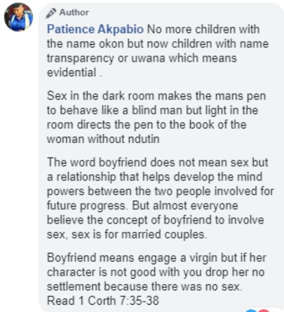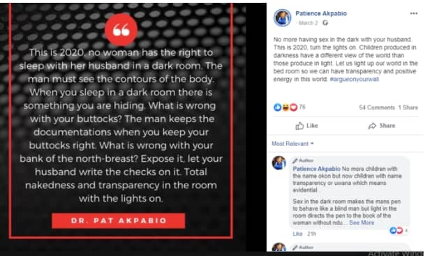 It doesn’t stop there, she also added that sex in the dark makes a man act like he is blind, while he gets a clearer direction when there is light. Patience Akpabio wrote in a rejoinder comment;