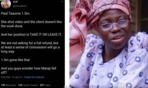 Commedian, Apaokagi Mariam, who is known as Taaooma has filed a case against a Twitter user who calls her out over unfinished business.