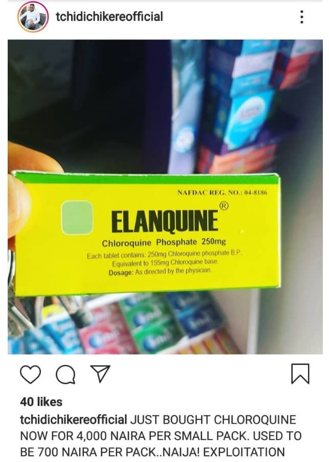 He wrote: “JUST BOUGHT CHLOROQUINE NOW FOR 4,000 NAIRA PER SMALL PACK. USED TO BE 700 NAIRA PER PACK..NAIJA! EXPLOITATION.”